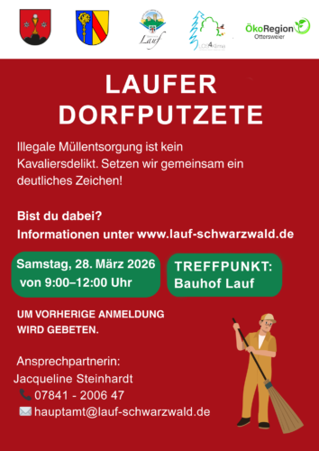 Die nächste Sprechstunde der Bürgermeisterin findet am Donnerstag, 26.03.2026, von 16:00 - 17:30 Uhr statt. Terminvereinbarung unter Tel. 07841 2006-13 (vormittags) oder Email: sekretariat@lauf-schwarzwald.de