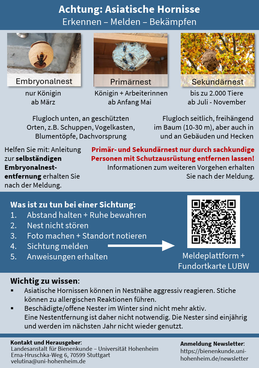 Für die Beseitigung von Primärnestern im Frühjahr hat das Ministerium für Ernährung, Ländlichen Raum und Verbraucherschutz (MLR) Finanzmittel zur Verfügung gestellt, welche durch den Landesverband Badischer Imker e.V. verwaltet werden. So können pro Entfernung eines Primärnestes durch eine sachkundige Person 60 Euro auf Nachweis ausgezahlt werden. Nester mit Arbeiterinnen sollten ausschließlich von sachkundigen Personen mit Schutzausrüstung entfernt werden, da eine Stichgefahr droht! Weitere Informationen zur Asiatischen Hornisse und wie sich die Art von heimischen Insekten unterscheiden lässt, finden sich auf der Homepage der LUBW https://www.lubw.baden-wuerttemberg.de/natur-und-landschaft/asiatische-hornisse sowie mit weiteren Details zu Nestern und der Nestentfernung auf der Homepage der Landesanstalt für Bienenkunde der Universität Hohenheim unter https://bienenkunde.uni-hohenheim.de/vespavelutina.